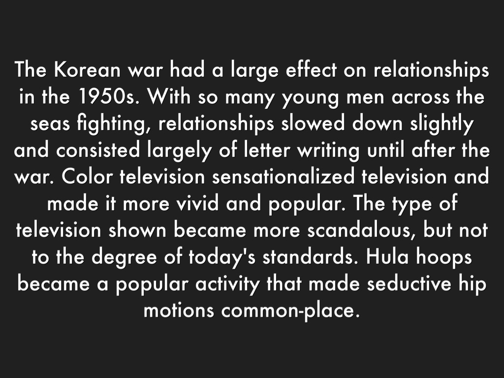The Korean war had a large effect on relationships in the 1950s. With so many young men across the seas fighting, relationships slowed down slightly and consisted largely of letter writing until after the war. Color television sensationalized television and made it more vivid and popular. The type of television shown became more scandalous, but not to the degree of today's standards. Hula hoops became a popular activity that made seductive hip motions common-place.