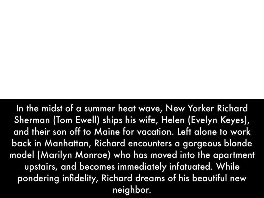In the midst of a summer heat wave, New Yorker Richard Sherman (Tom Ewell) ships his wife, Helen (Evelyn Keyes), and their son off to Maine for vacation. Left alone to work back in Manhattan, Richard encounters a gorgeous blonde model (Marilyn Monroe) who has moved into the apartment upstairs, and becomes immediately infatuated. While pondering infidelity, Richard dreams of his beautiful new neighbor.