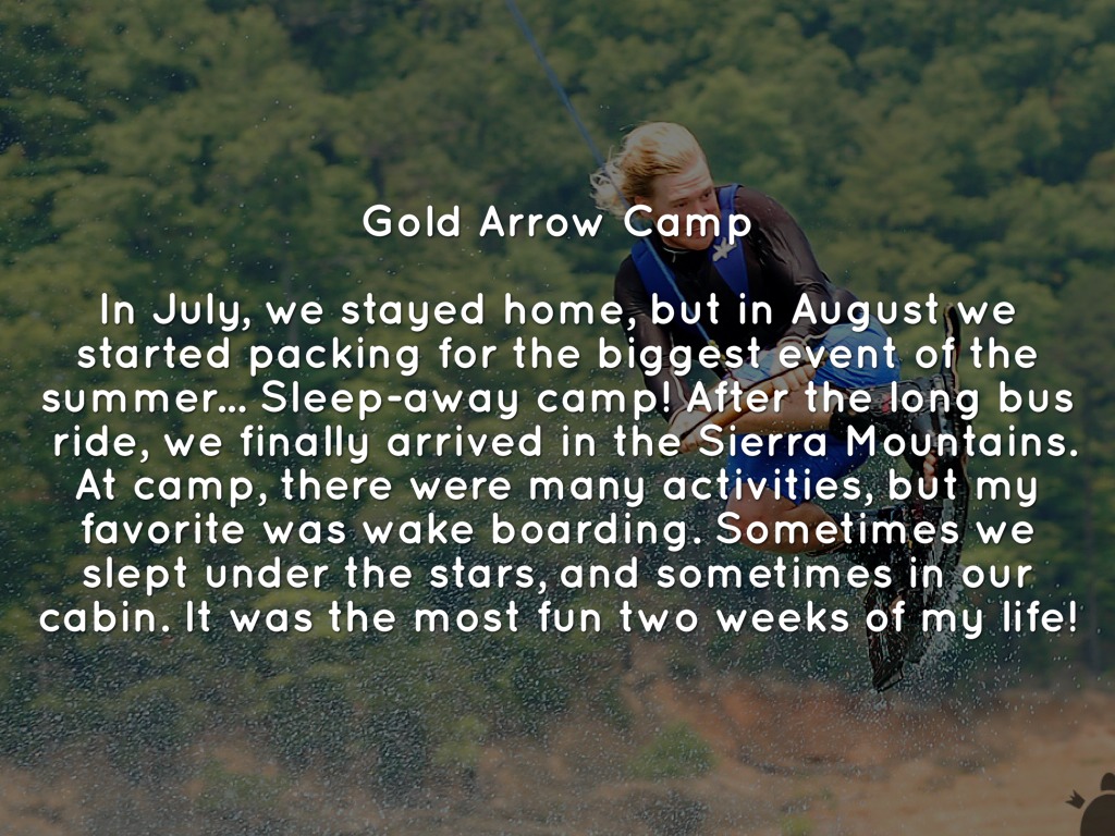 In July, we stayed home, but in August we started packing for the biggest event of the summer... Sleep-away camp! After the long bus ride, we finally arrived in the Sierra Mountains. At camp, there were many activities, but my favorite was wake boarding. Sometimes we slept under the stars, and sometimes in our cabin. It was the most fun two weeks of my life!