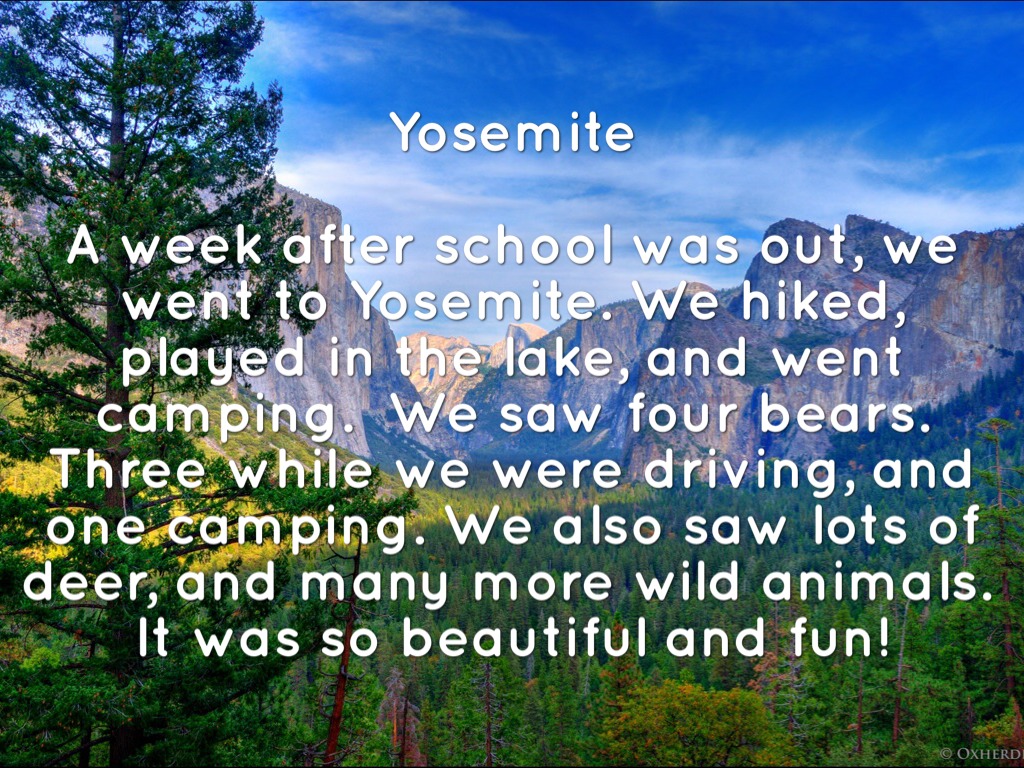 A week after school was out, we went to Yosemite. We hiked, played in the lake, and went camping. We saw four bears. Three while we were driving, and one camping. We also saw lots of deer, and many more wild animals. It was so beautiful and fun!