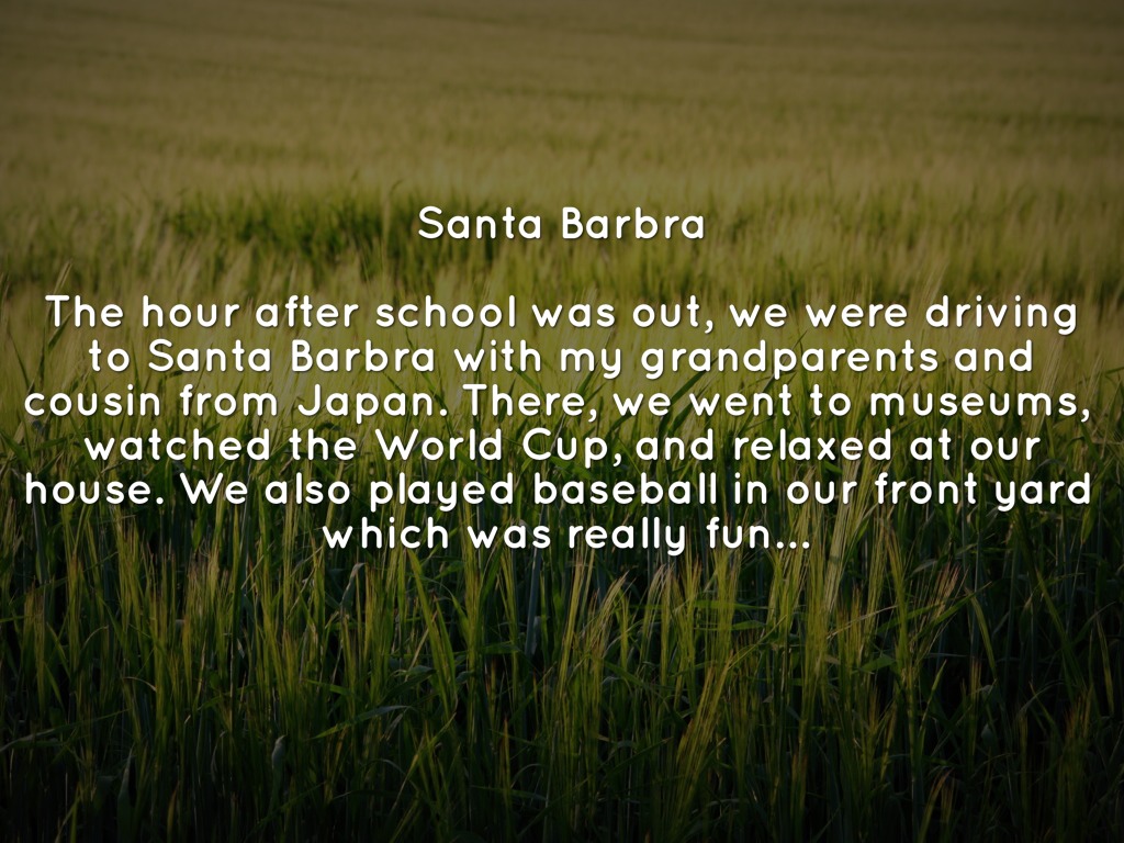 The hour after school was out, we were driving to Santa Barbra with my grandparents and cousin from Japan. There, we went to museums, watched the World Cup, and relaxed at our house. We also played baseball in our front yard which was really fun