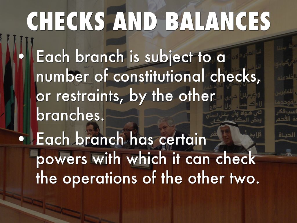 Each branch is subject to a number of constitutional checks, or restraints, by the other branches.