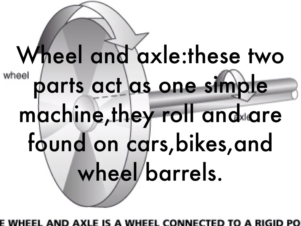 Wheel and axle:these two parts act as one simple machine,they roll and are found on cars,bikes,and wheel barrels.