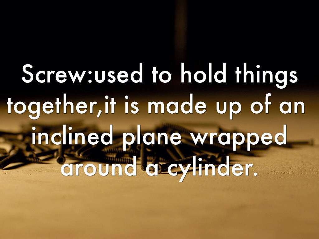 Screw:used to hold things together,it is made up of an inclined plane wrapped around a cylinder.