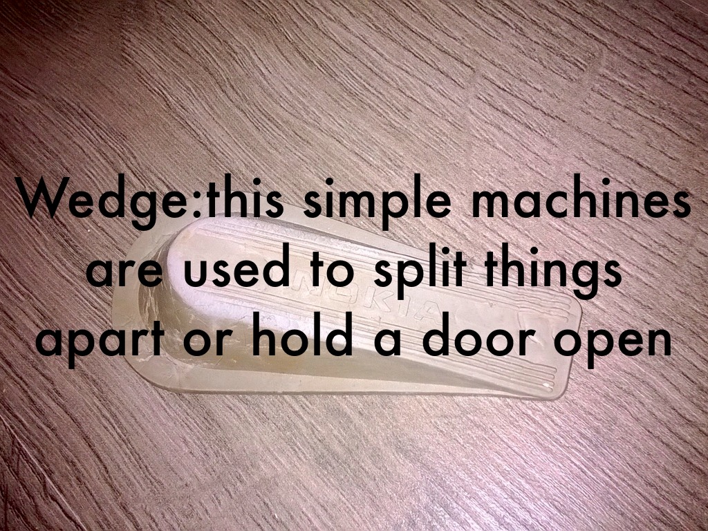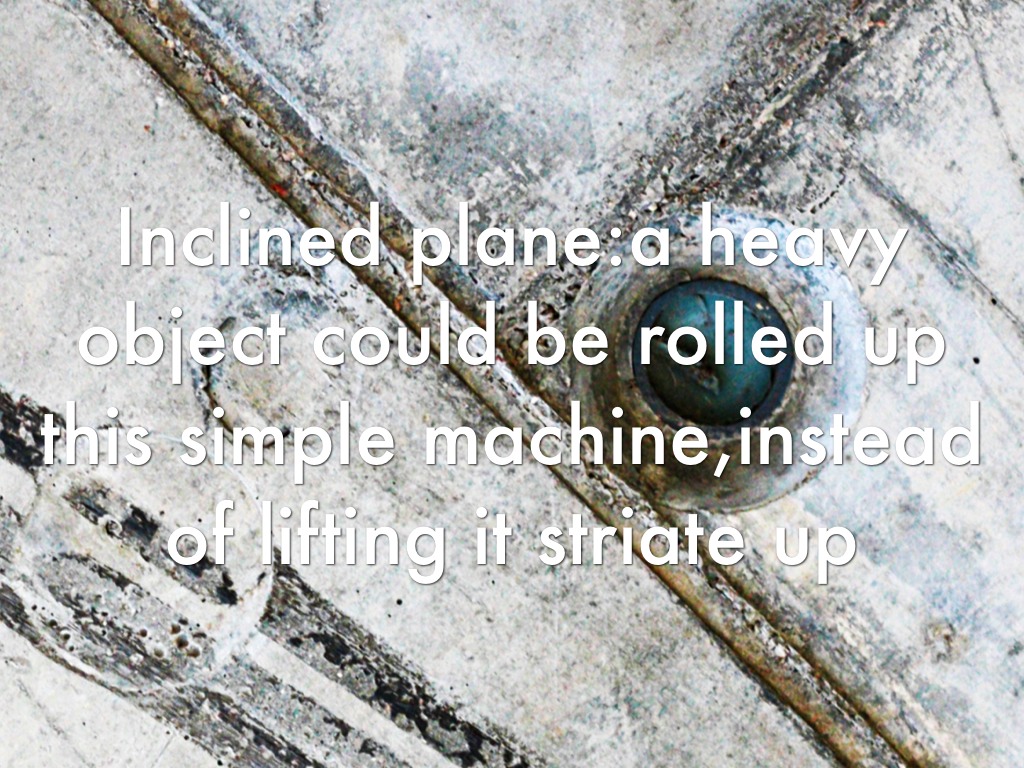 Inclined plane:a heavy object could be rolled up this simple machine,instead of lifting it striate up