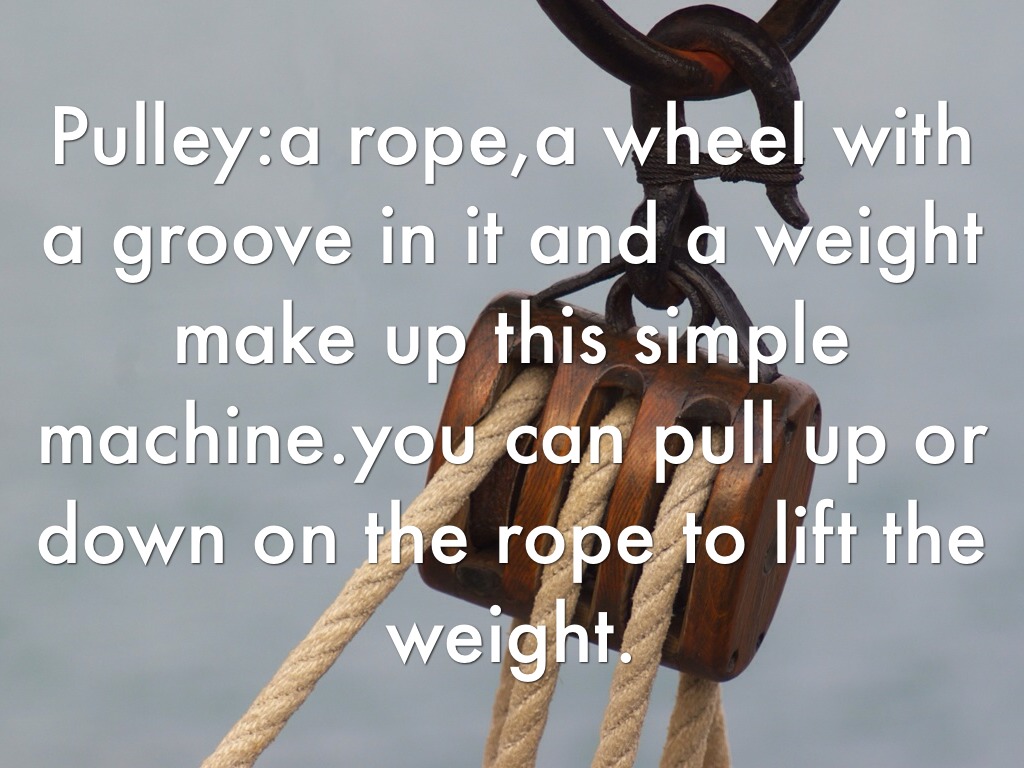 Pulley:a rope,a wheel with a groove in it and a weight make up this simple machine.you can pull up or down on the rope to lift the weight.