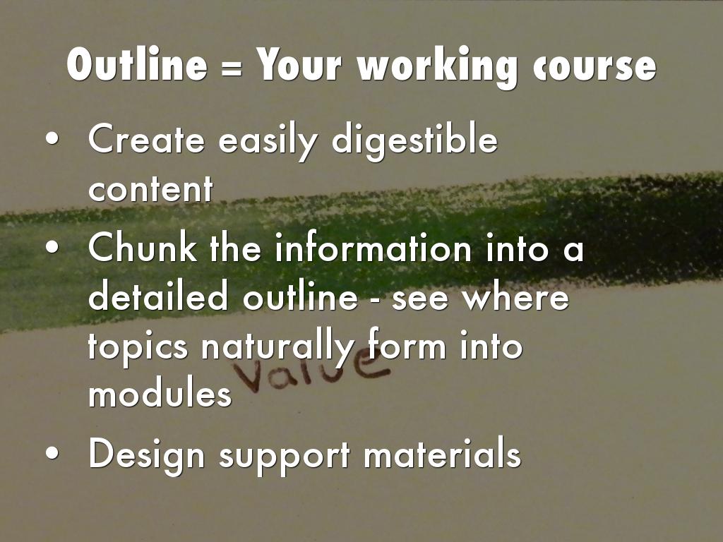 - Chunk the information into a detailed outline - see where topics naturally form into modules