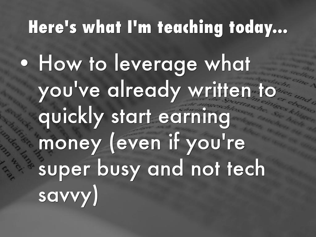 - How to leverage what you've already written to quickly start earning money (even if you're super busy and not tech savvy)