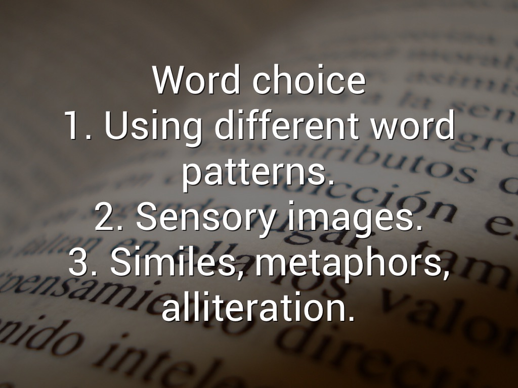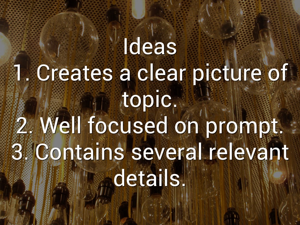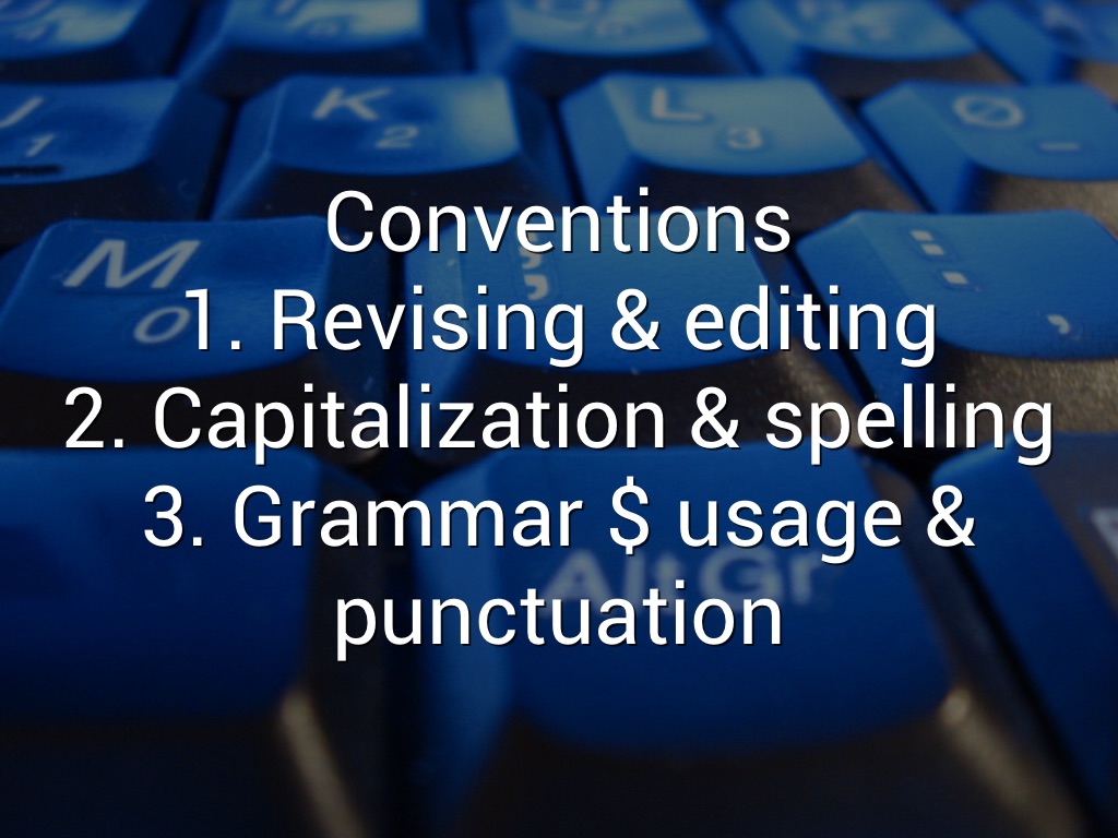 1.IDEAS 2.ORGANIZATION 3.VOICE 4.WORD CHOICE 5.SENTENCES 6. CONVENTIONS