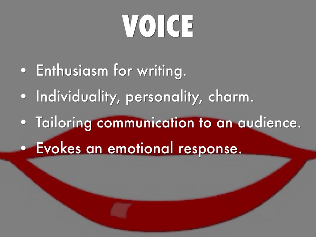 IDEAS, ORGANIZATION, VOICE, WORD CHOICE, FLUENCY, CONVENTIONS