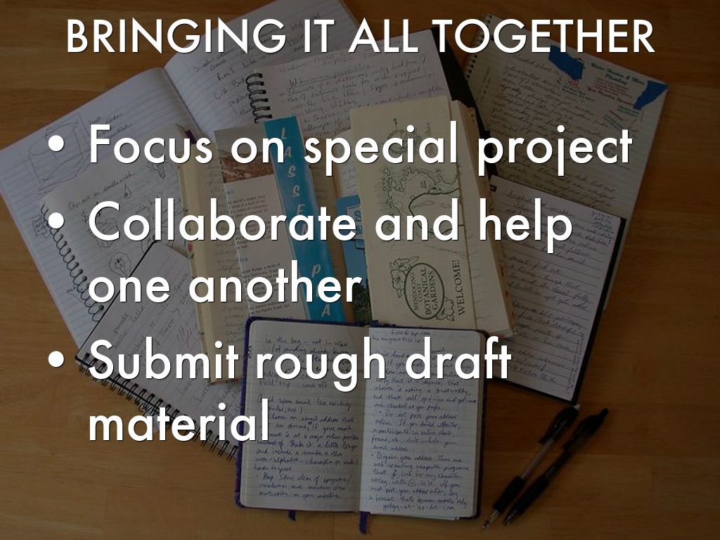 // mindmaps // outlines // selected annotated bibliography (which sources you're using and why) // slides // free writing // drafts of sections or draft of work if rough but finished