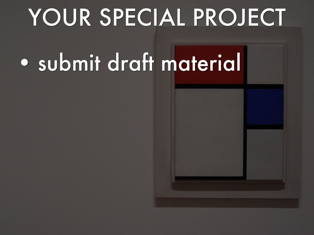 I'm very interested in seeing what you have so far, and then having a conversation or two about what you expect your final submission will look like. If you're behind on the project and the idea of submitting materials this week gives you serious stress, just please let me know via email. The goal is not to stress you out, but rather to help keep you on task, and create a series of conversations over the final weeks around your project.