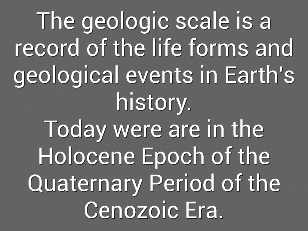 Today were are in the Holocene Epoch of the Quaternary Period of the Cenozoic Era.