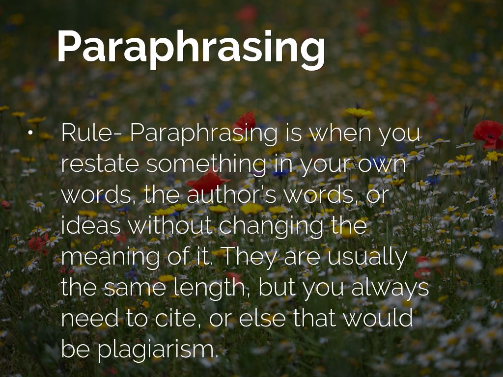 Rule- Paraphrasing is when you restate something in your own words, the author's words, or ideas without changing the meaning of it. They are usually the same length, but you always need to cite, or else that would be plagiarism.