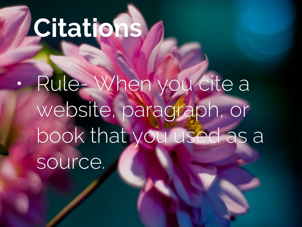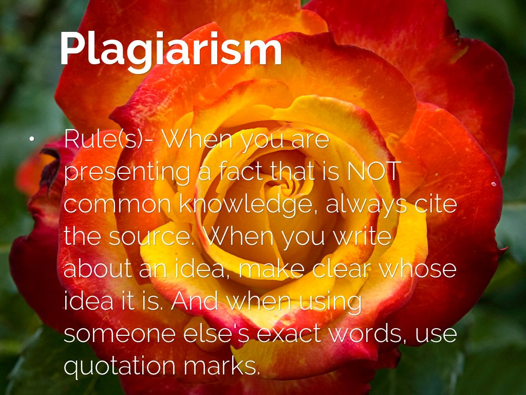 Rule(s)- When you are presenting a fact that is NOT common knowledge, always cite the source. When you write about an idea, make clear whose idea it is. And when using someone else's exact words, use quotation marks.