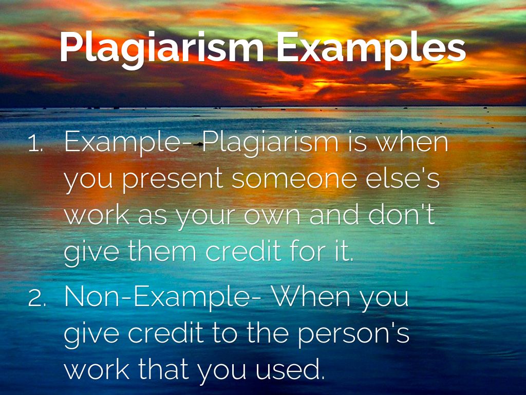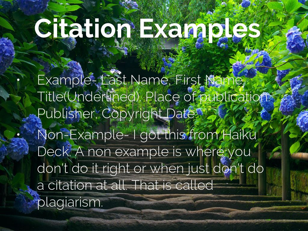 Non-Example- I got this from Haiku Deck. A non example is where you don't do it right or when just don't do a citation at all. That is called plagiarism.