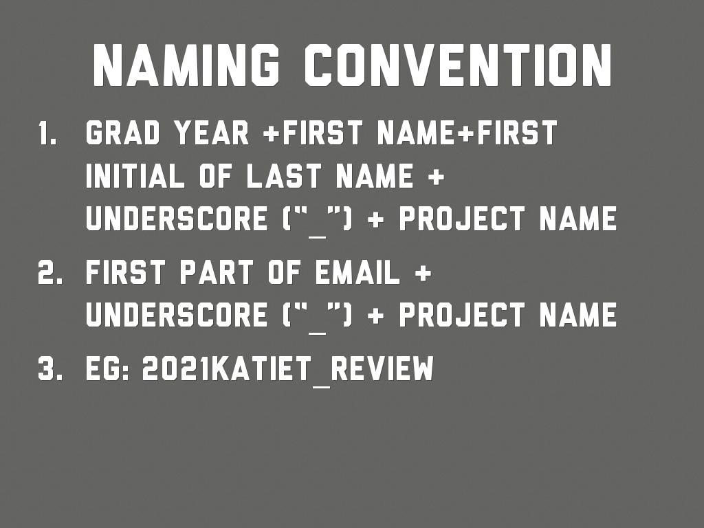 GRAD YEAR +FIRST NAME+FIRST INITIAL OF LAST NAME + UNDERSCORE (“_”) + PROJECT NAME