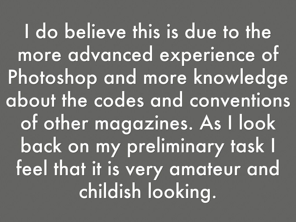 I do believe this is due to the more advanced experience of Photoshop and more knowledge about the codes and conventions of other magazines. As I look back on my preliminary task I feel that it is very amateur and childish looking.