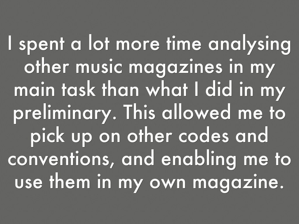 I spent a lot more time analysing other music magazines in my main task than what I did in my preliminary. This allowed me to pick up on other codes and conventions, and enabling me to use them in my own magazine.