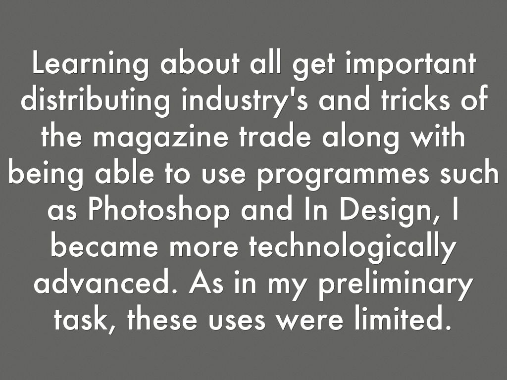 Learning about all get important distributing industry's and tricks of the magazine trade along with being able to use programmes such as Photoshop and In Design, I became more technologically advanced. As in my preliminary task, these uses were limited.