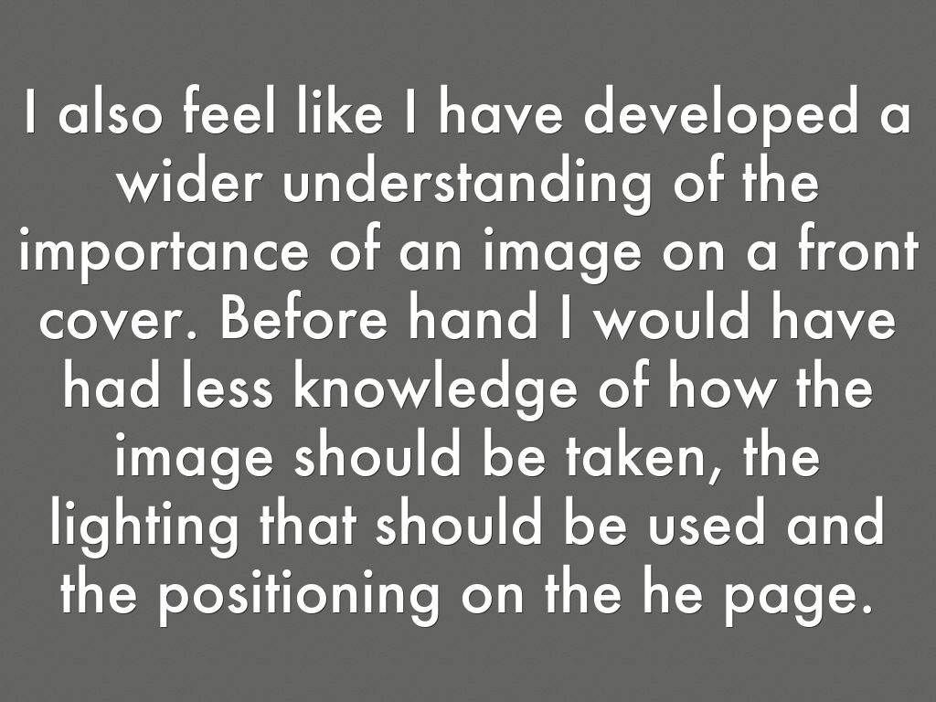 I also feel like I have developed a wider understanding of the importance of an image on a front cover. Before hand I would have had less knowledge of how the image should be taken, the lighting that should be used and the positioning on the he page.