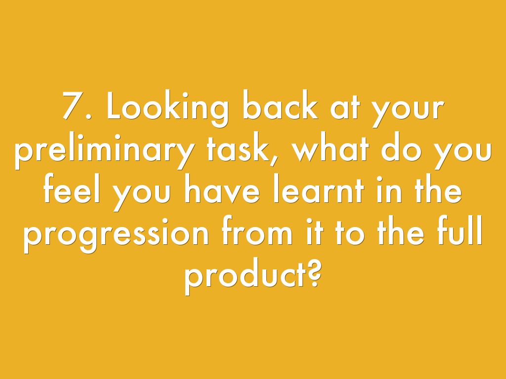 7. Looking back at your preliminary task, what do you feel you have learnt in the progression from it to the full product?