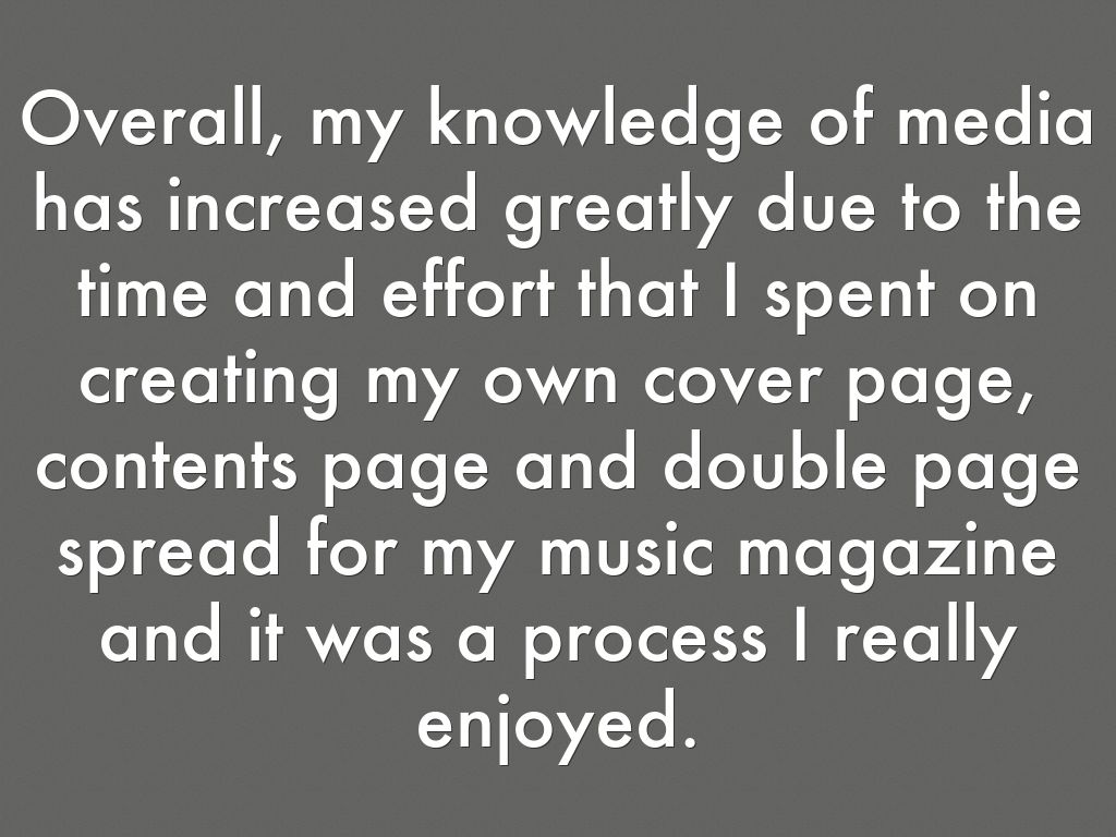 Overall, my knowledge of media has increased greatly due to the time and effort that I spent on creating my own cover page, contents page and double page spread for my music magazine and it was a process I really enjoyed.