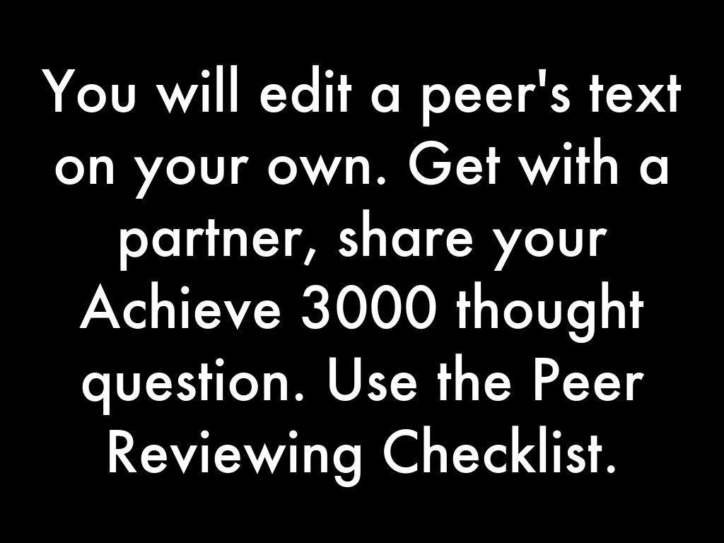 You will edit a peer's text on your own. Get with a partner, share your Achieve 3000 thought question. Use the Peer Reviewing Checklist.