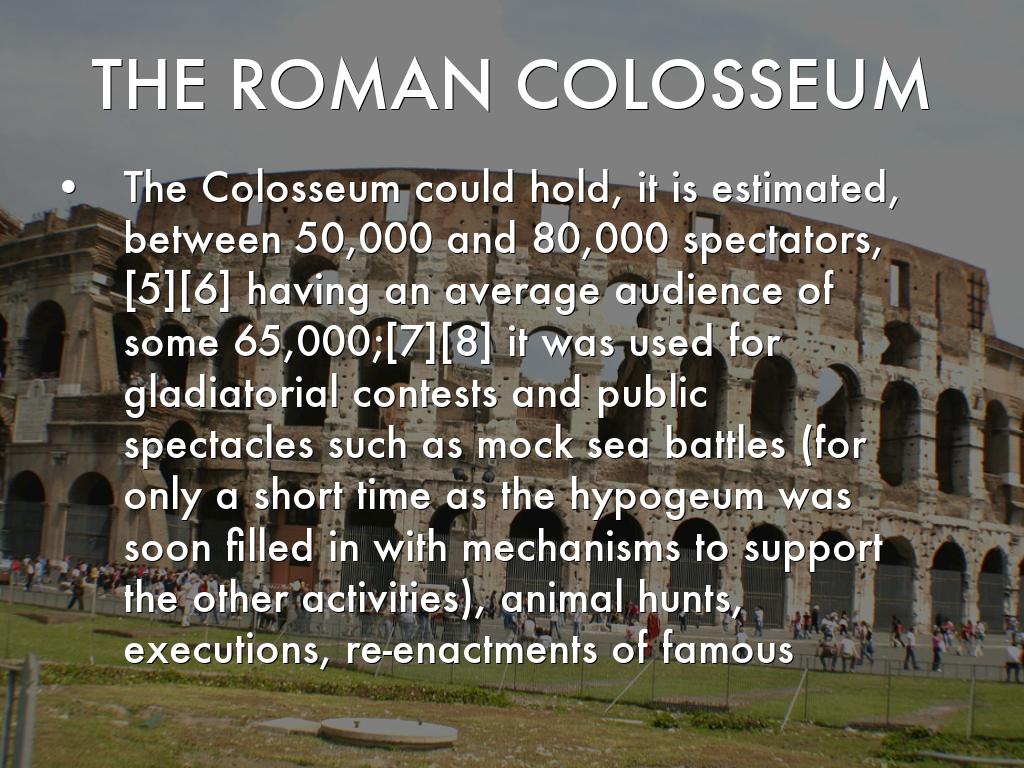 The Colosseum could hold, it is estimated, between 50,000 and 80,000 spectators,[5][6] having an average audience of some 65,000;[7][8] it was used for gladiatorial contests and public spectacles such as mock sea battles (for only a short time as the hypogeum was soon filled in with mechanisms to support the other activities), animal hunts, executions, re-enactments of famous battles, and dramas based on Classical mythology.