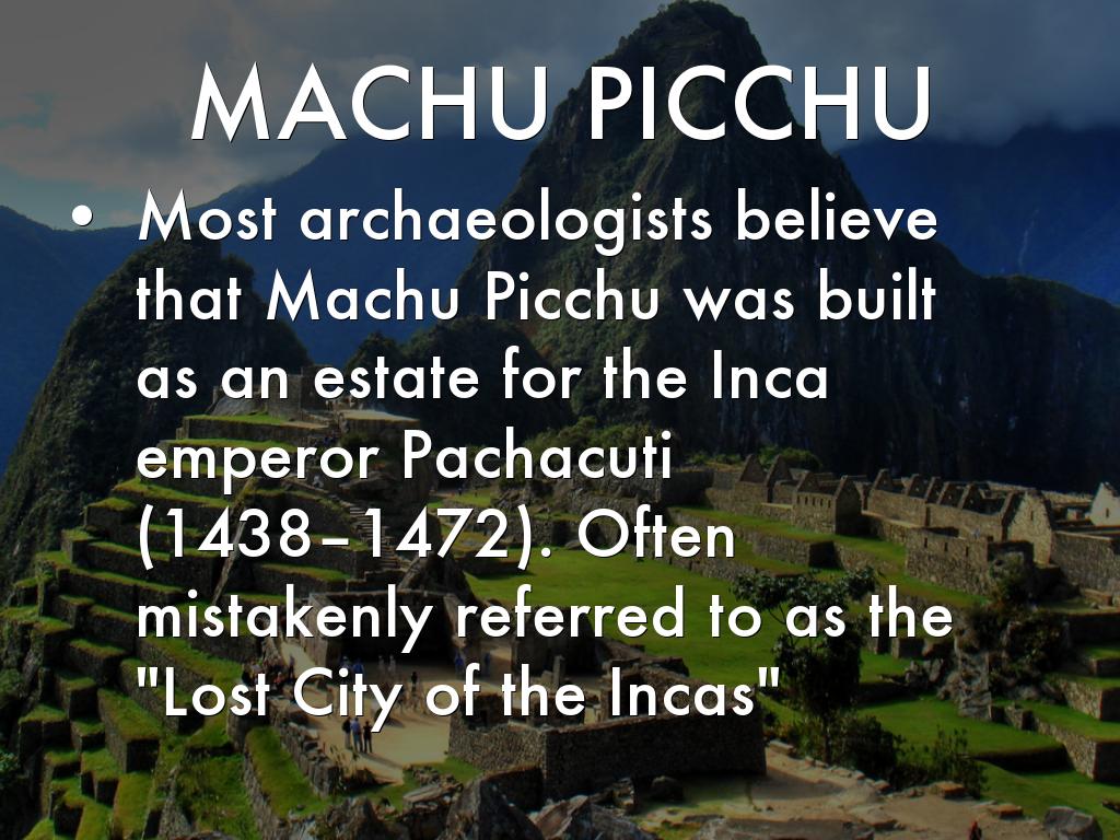 Most archaeologists believe that Machu Picchu was built as an estate for the Inca emperor Pachacuti (1438–1472). Often mistakenly referred to as the "Lost City of the Incas"
