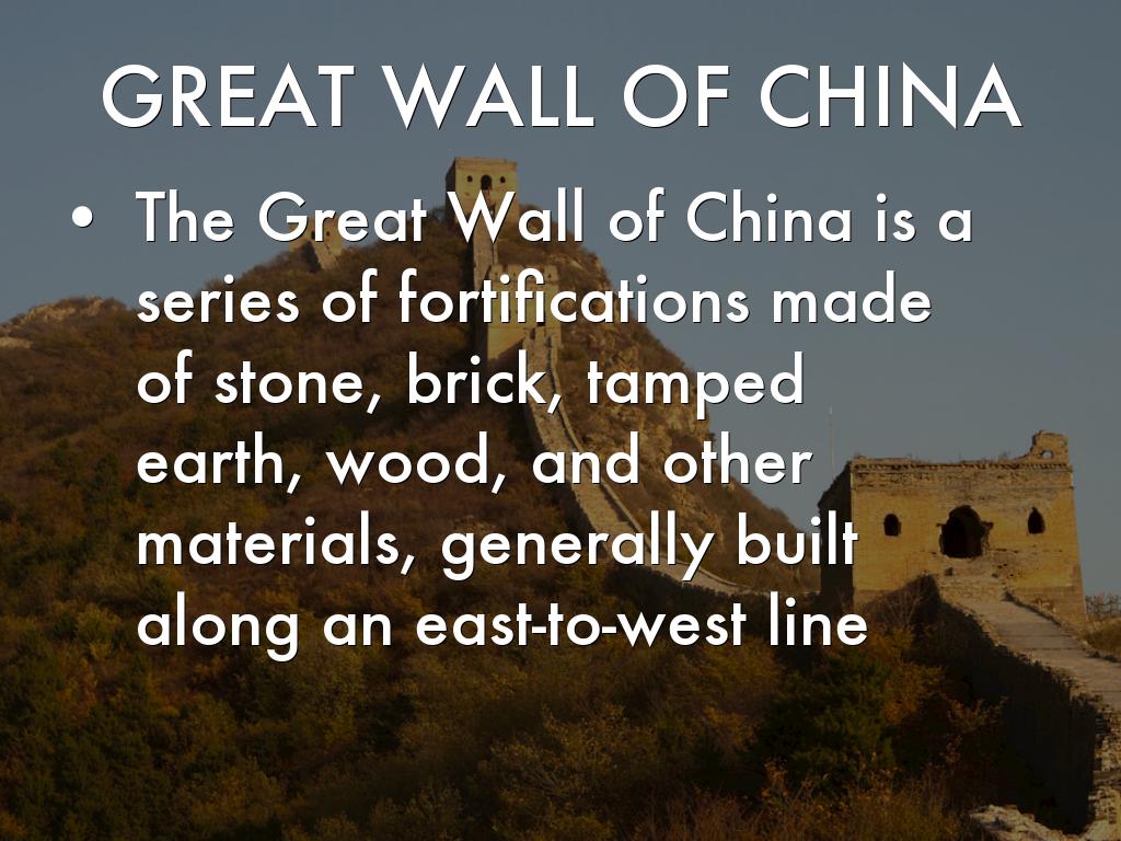 The Great Wall of China is a series of fortifications made of stone, brick, tamped earth, wood, and other materials, generally built along an east-to-west line