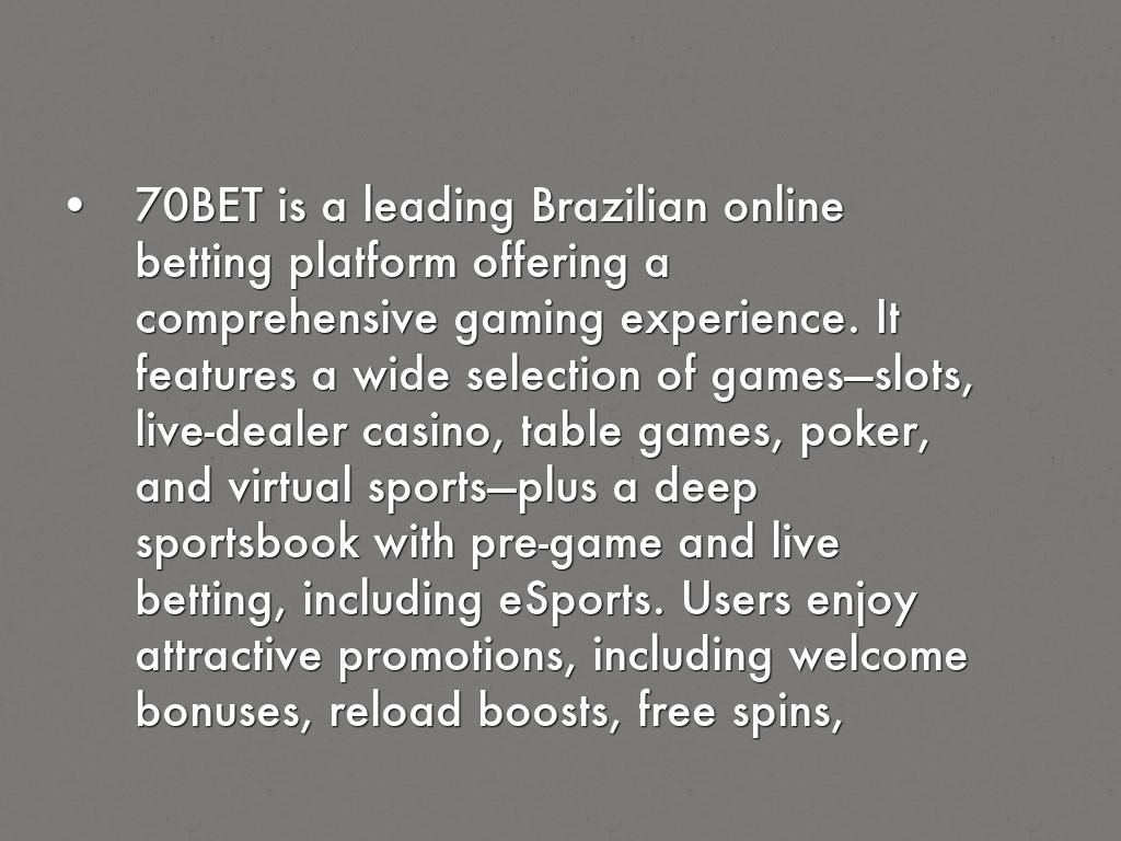 70BET is a leading Brazilian online betting platform offering a comprehensive gaming experience. It features a wide selection of games—slots, live-dealer casino, table games, poker, and virtual sports—plus a deep sportsbook with pre-game and live betting, including eSports. Users enjoy attractive promotions, including welcome bonuses, reload boosts, free spins, cashback, and loyalty rewards. The platform supports mobile play (iOS & Android), provides 24/7 customer support, and delivers a smooth, engaging betting experience.