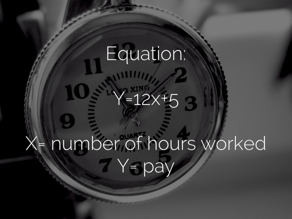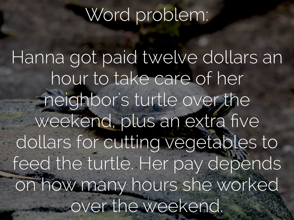 Hanna got paid twelve dollars an hour to take care of her neighbor's turtle over the weekend, plus an extra five dollars for cutting vegetables to feed the turtle. Her pay depends on how many hours she worked over the weekend.