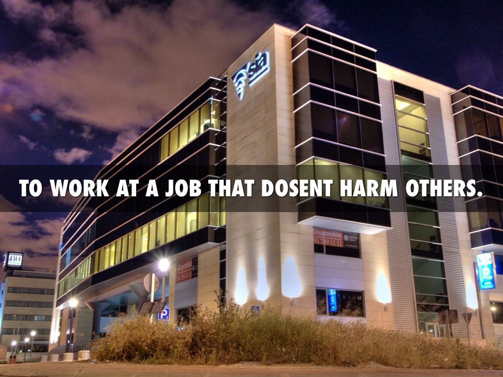 TO WORK AT A JOB THAT DOSENT HARM OTHERS.