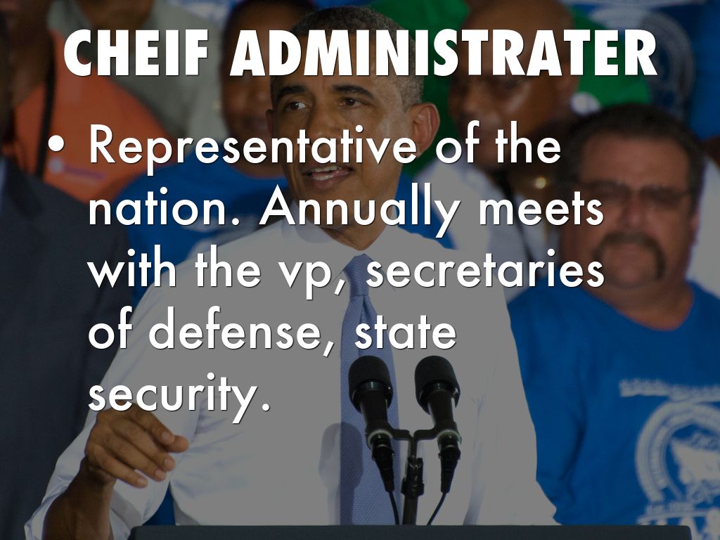 Representative of the nation. Annually meets with the vp, secretaries of defense, state security.