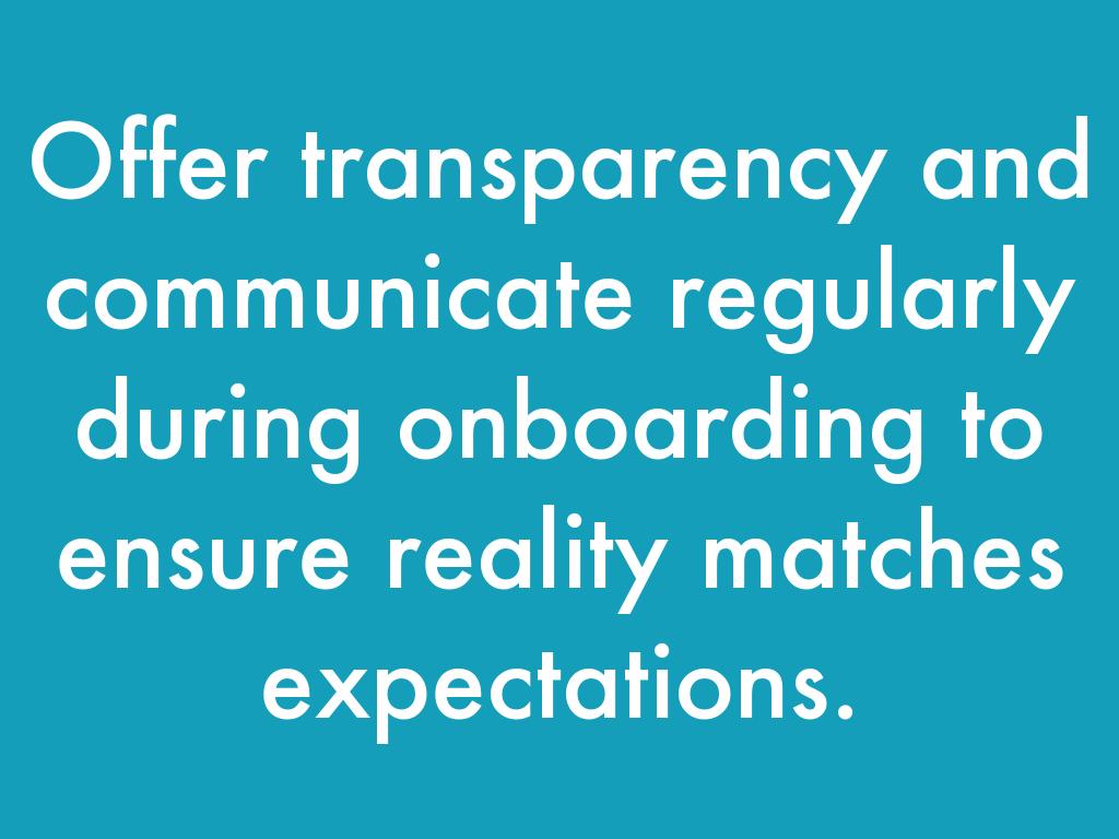 Offer transparency and communicate regularly during onboarding to ensure reality matches expectations.