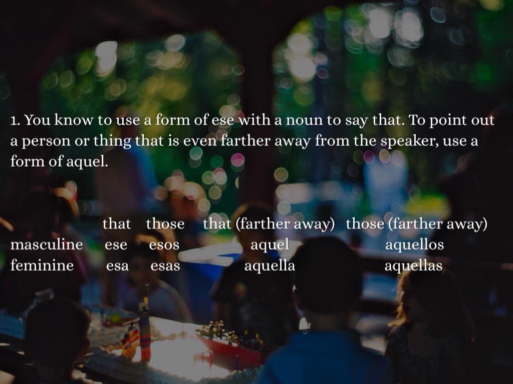 1. You know to use a form of ese with a noun to say that. To point out a person or thing that is even farther away from the speaker, use a form of aquel.