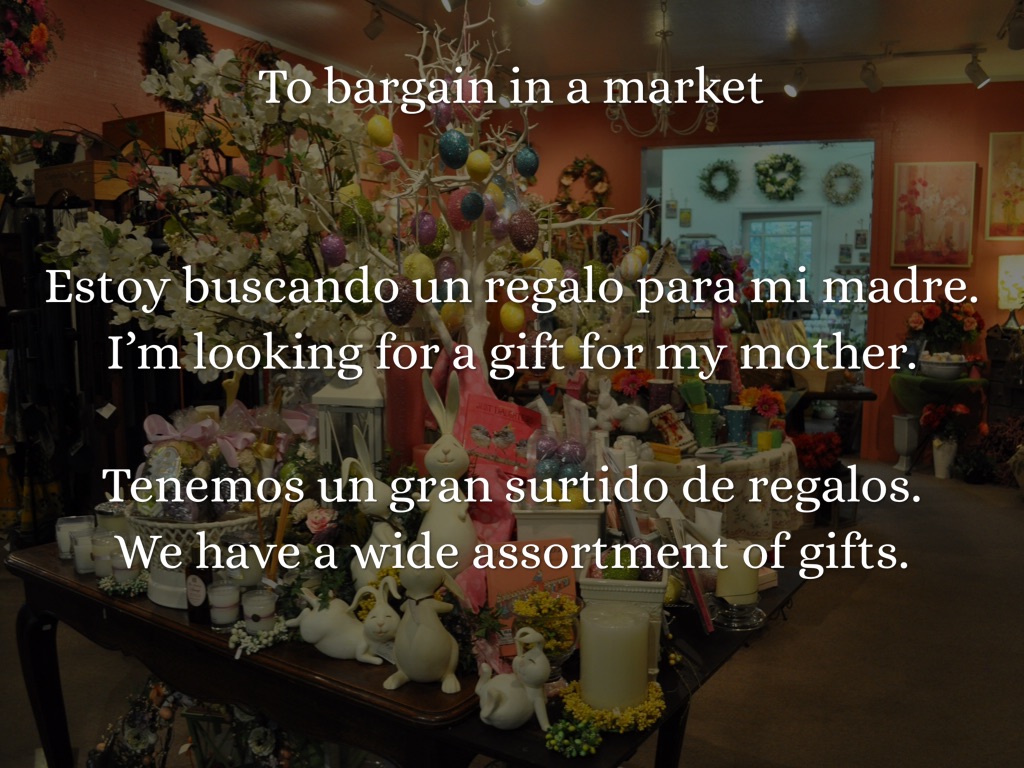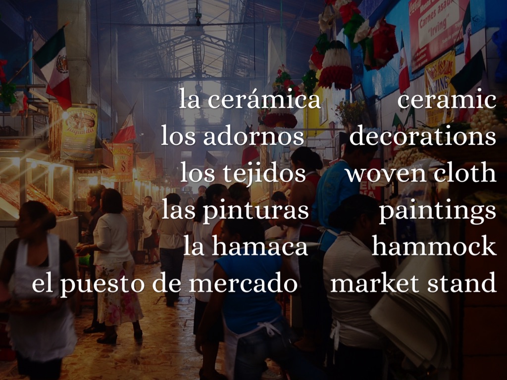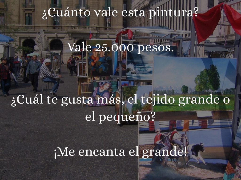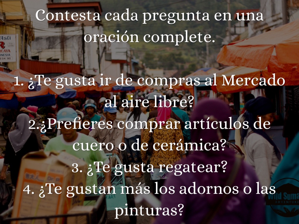 1. ¿Te gusta ir de compras al Mercado al aire libre? 2.¿Prefieres comprar artículos de cuero o de cerámica? 3. ¿Te gusta regatear? 4. ¿Te gustan más los adornos o las pinturas?