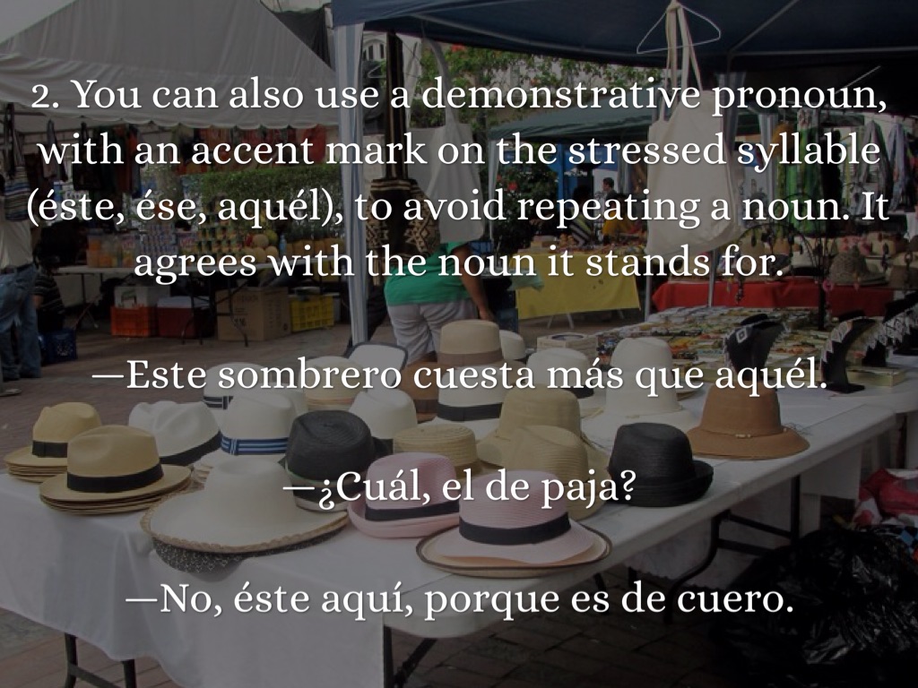 2. You can also use a demonstrative pronoun, with an accent mark on the stressed syllable (éste, ése, aquél), to avoid repeating a noun. It agrees with the noun it stands for.