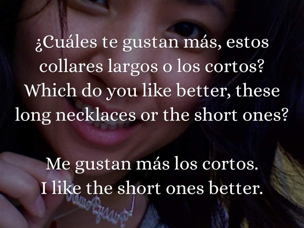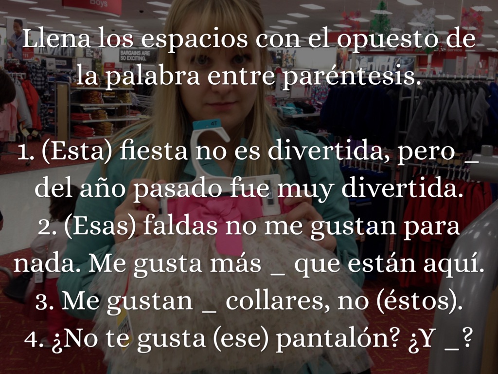 1. (Esta) fiesta no es divertida, pero _ del año pasado fue muy divertida. 2. (Esas) faldas no me gustan para nada. Me gusta más _ que están aquí. 3. Me gustan _ collares, no (éstos). 4. ¿No te gusta (ese) pantalón? ¿Y _?