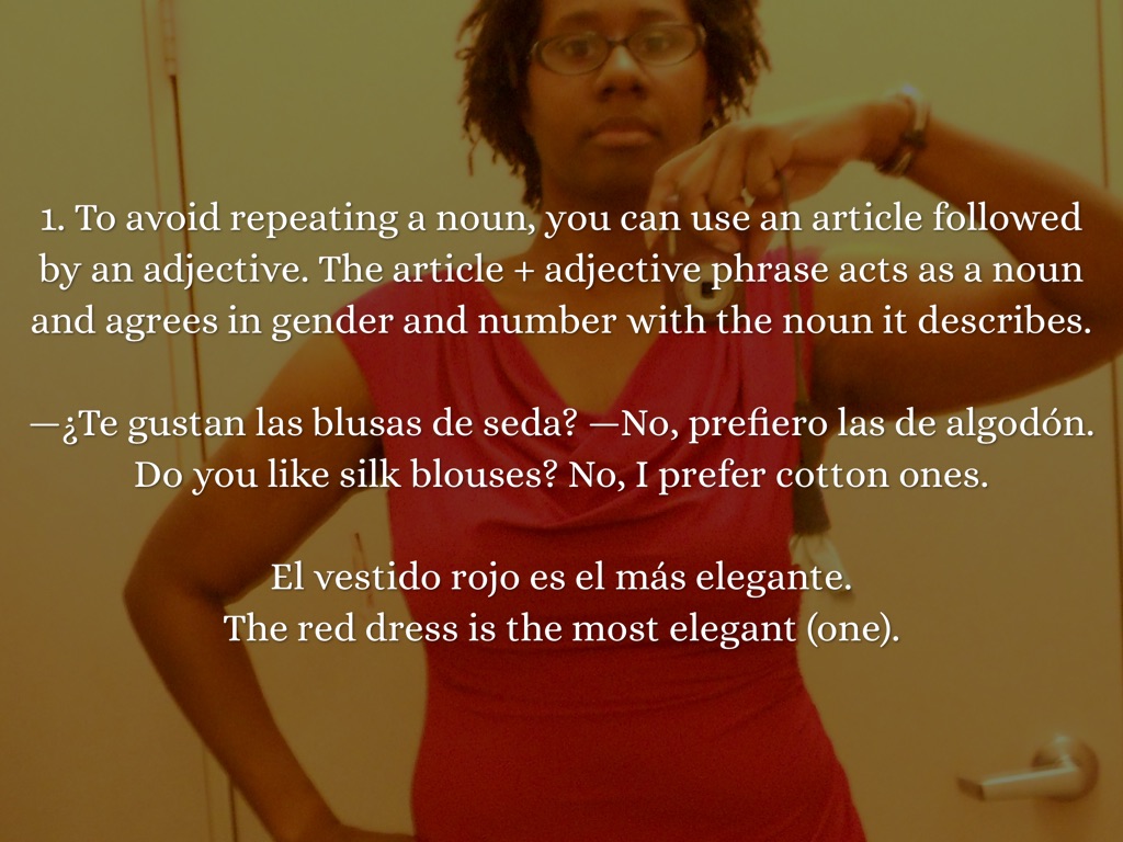 1. To avoid repeating a noun, you can use an article followed by an adjective. The article + adjective phrase acts as a noun and agrees in gender and number with the noun it describes.