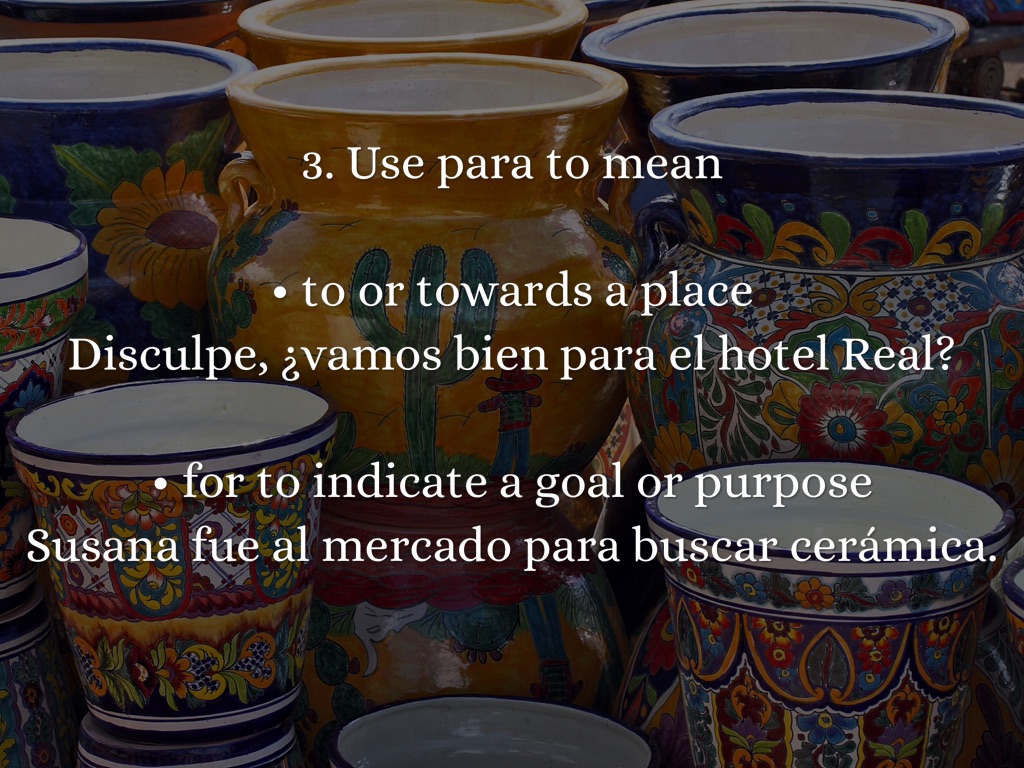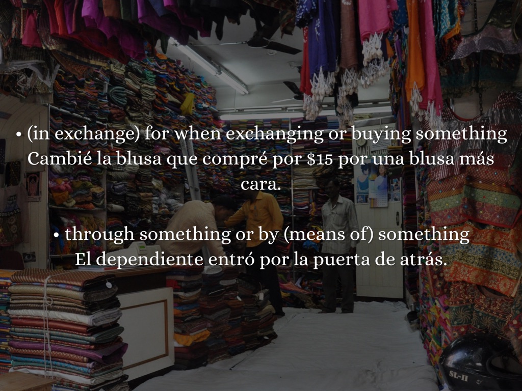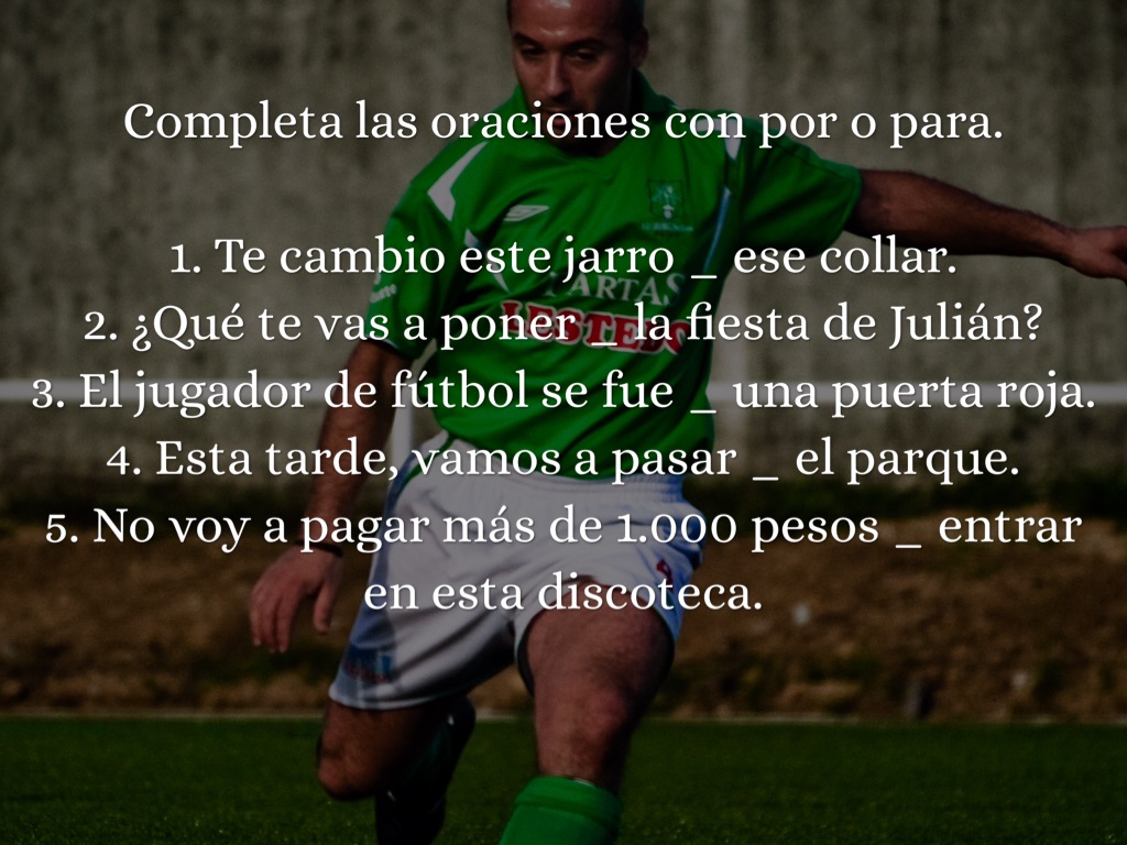 1. Te cambio este jarro _ ese collar. 2. ¿Qué te vas a poner _ la fiesta de Julián? 3. El jugador de fútbol se fue _ una puerta roja. 4. Esta tarde, vamos a pasar _ el parque. 5. No voy a pagar más de 1.000 pesos _ entrar en esta discoteca.
