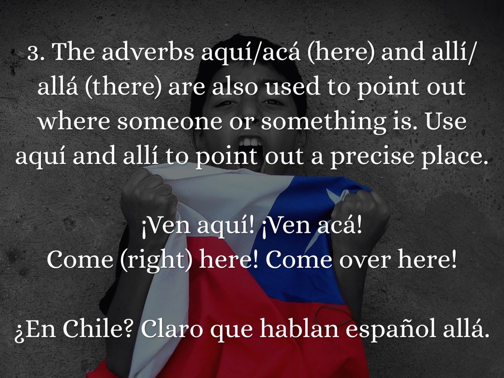 3. The adverbs aquí/acá (here) and allí/allá (there) are also used to point out where someone or something is. Use aquí and allí to point out a precise place.