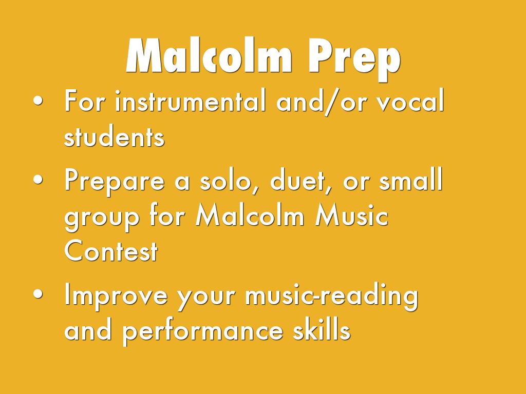Prepare a solo, duet, or small group for Malcolm Music Contest