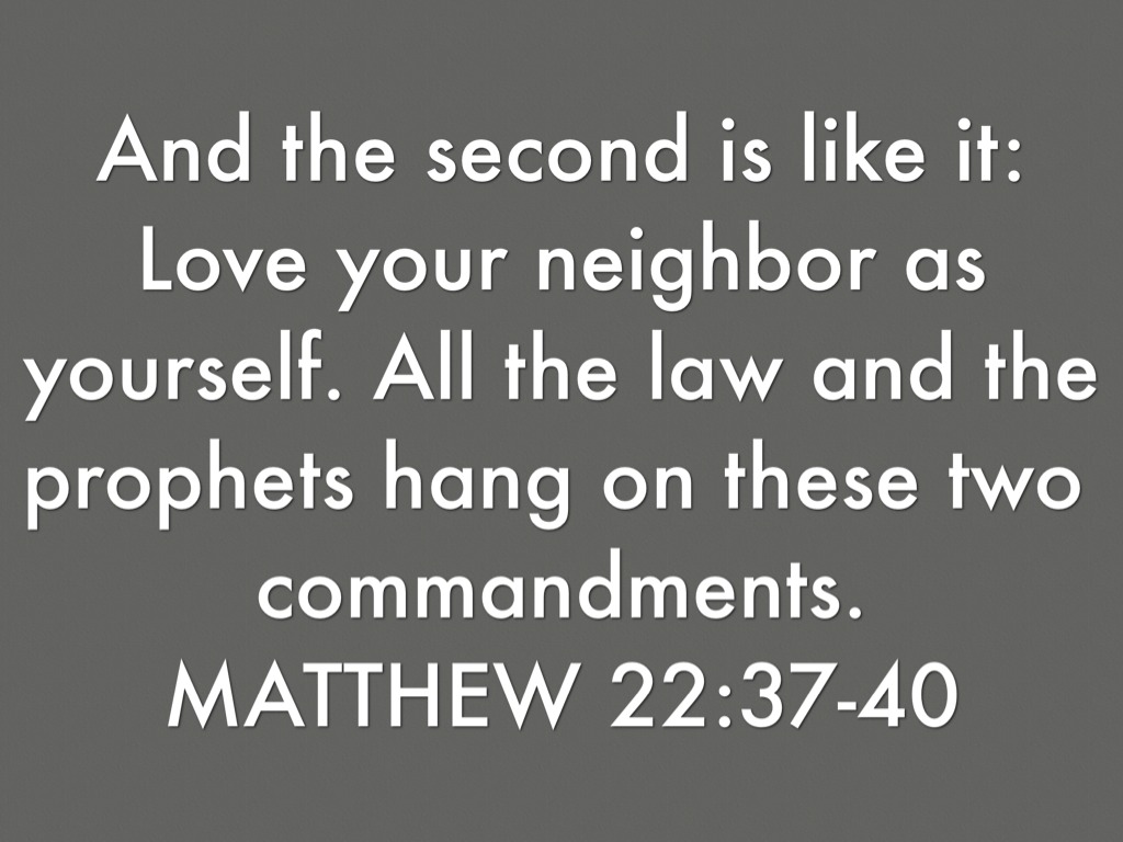 And the second is like it: Love your neighbor as yourself. All the law and the prophets hang on these two commandments.