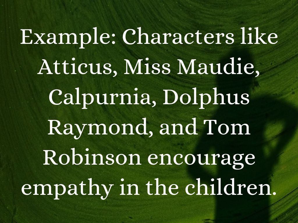 Example: Characters like Atticus, Miss Maudie, Calpurnia, Dolphus Raymond, and Tom Robinson encourage empathy in the children.