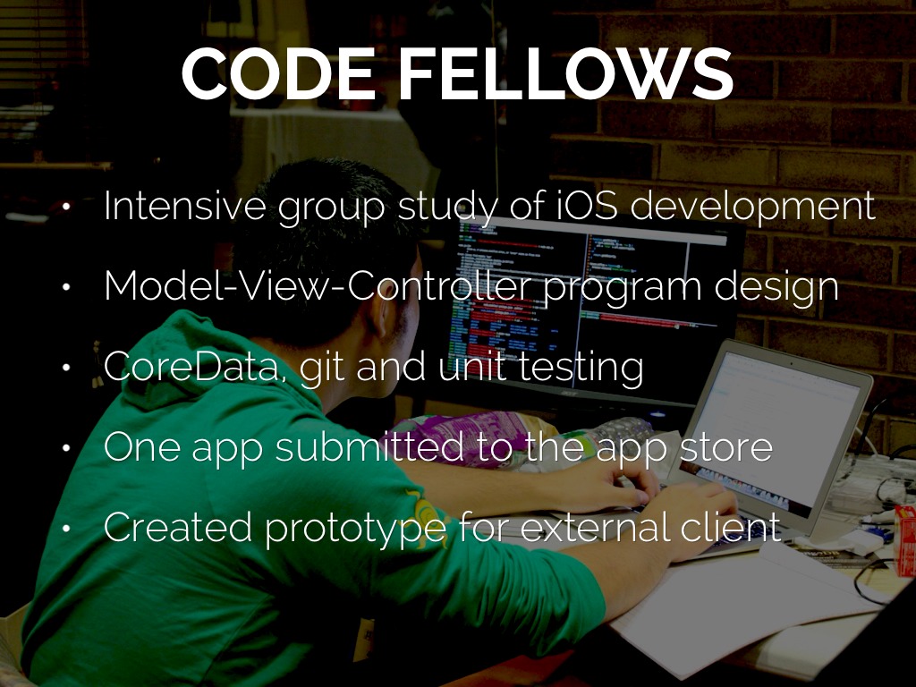 I am a recent graduate from the Code Fellows iOS Accelerator: An 8 week intensive study of all things relating to iOS, Objective-C and professional dev work.