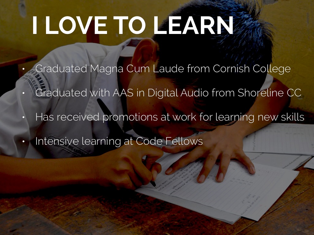 - Graduated with AAS in Digital Audio from Shoreline CC