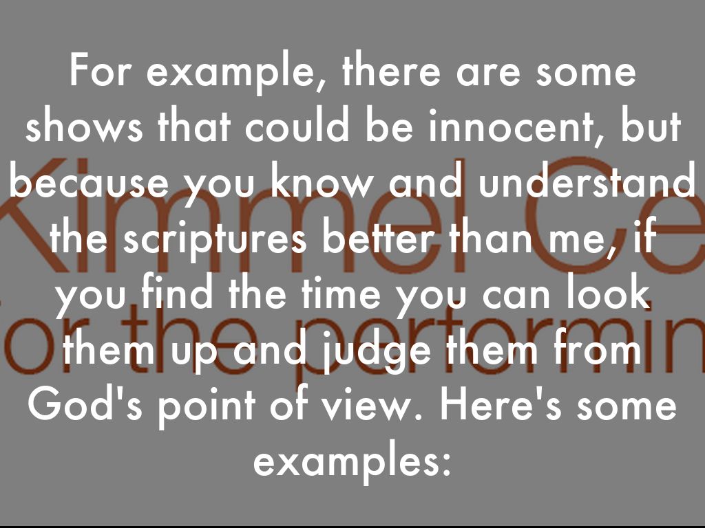 For example, there are some shows that could be innocent, but because you know and understand the scriptures better than me, if you find the time you can look them up and judge them from God's point of view. Here's some examples: