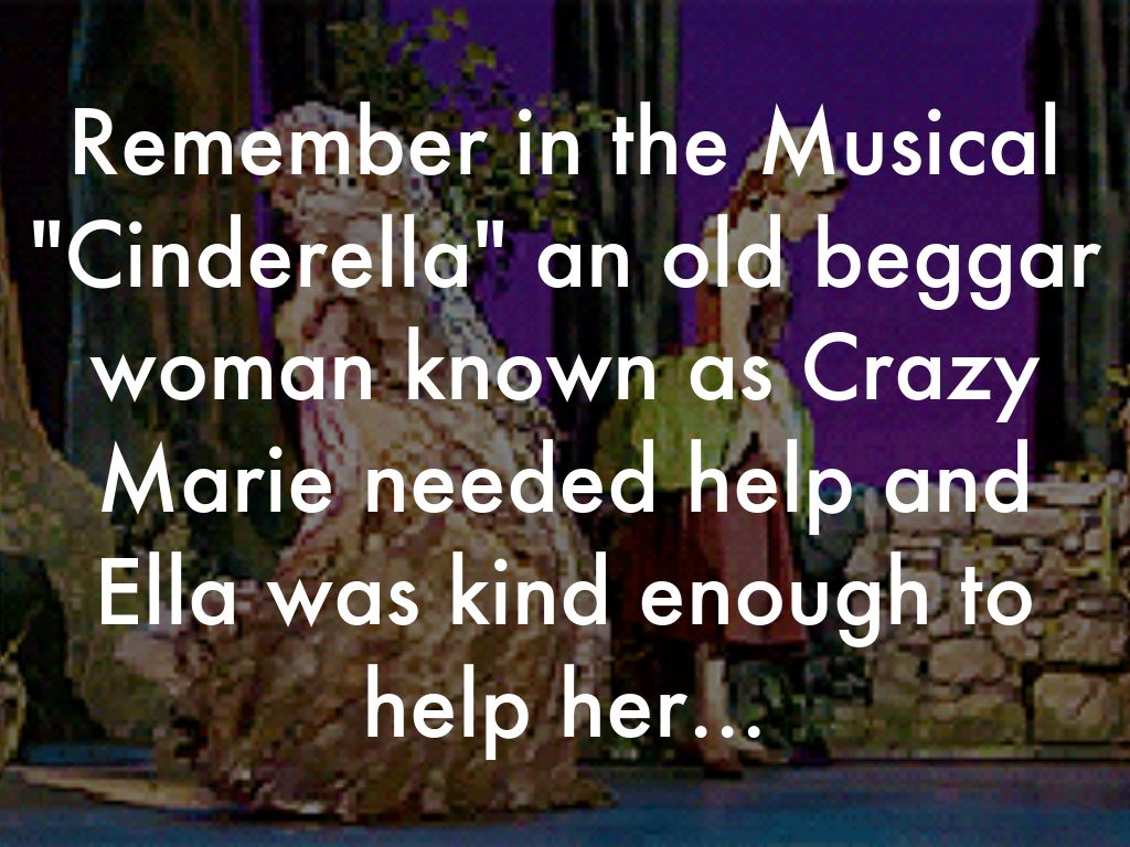 Remember in the Musical "Cinderella" an old beggar woman known as Crazy Marie needed help and Ella was kind enough to help her...